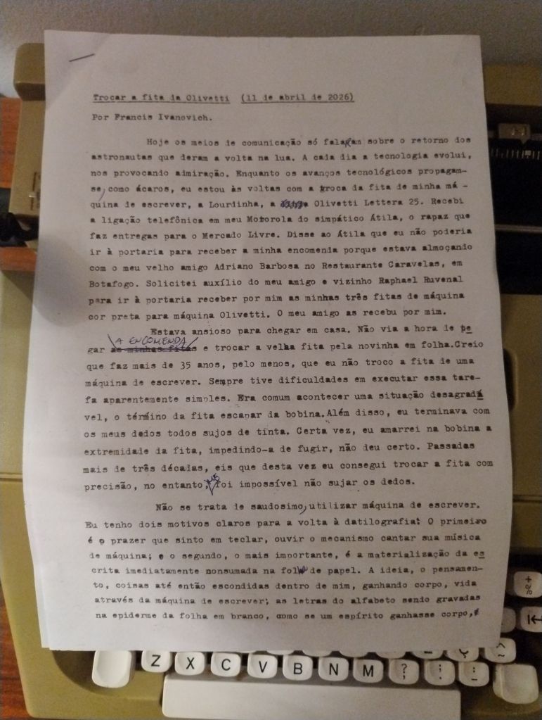 Não se trata de saudosismo para utilizar máquina de escrever. Eu tenho dois motivos claros para a volta à datilografia: o primeiro é o prazer que sinto em teclar, ouvir o mecanismo cantar sua música de máquina; o segundo, o mais importante, é a materialização da escrita imediatamente consumada na folha de papel. A ideia, o pensamento, coisas até então escondidas dentro de mim, ganhando corpo, vida através da máquina de escrever; as letras do alfabeto sendo gravadas na epiderme da folha em branco, como se um espírito ganhasse corpo, deixando de ser imaterial para tornar-se objeto ao alcance de qualquer ser humano. Está bem cansativo esse mundo virtual que estamos vivendo. A nossa vida a cada dia se desmaterializa, reduz-se a um algoritmo, nossa despersonalização se implementa. Não somos mais uma pessoa de carne e osso, mas uma face que a tecnologia reconhece, uma biometria que nos confere autenticidade, um holograma da existência. Já não precisamos ir à agência bancária, nós somos o próprio Banco, e volta e meia somos assaltados, como antigamente, não os bandidos com armas em punho, mas por hackers que são mil vezes mais nocivos. Voltar a escrever na máquina, de maneira direta, sem intermediação de um programa, um software, um aplicativo, é libertador. Em tempos de IA, em que a falsificação, o plágio, a cópia estão em voga, ver um texto nascer na folha em branco de maneira instantânea é por demais libertador.