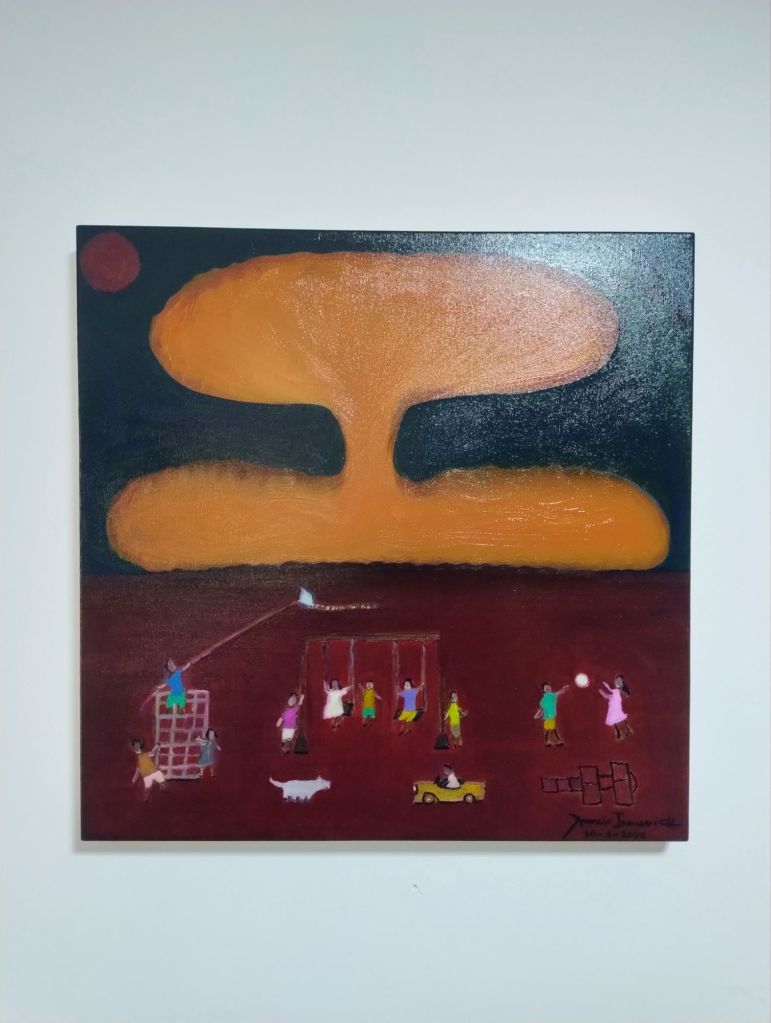 A minha última pintura trata dessa questão. Na tela, vemos um gigantesco cogumelo, enquanto crianças brincam despreocupadamente sob ele.